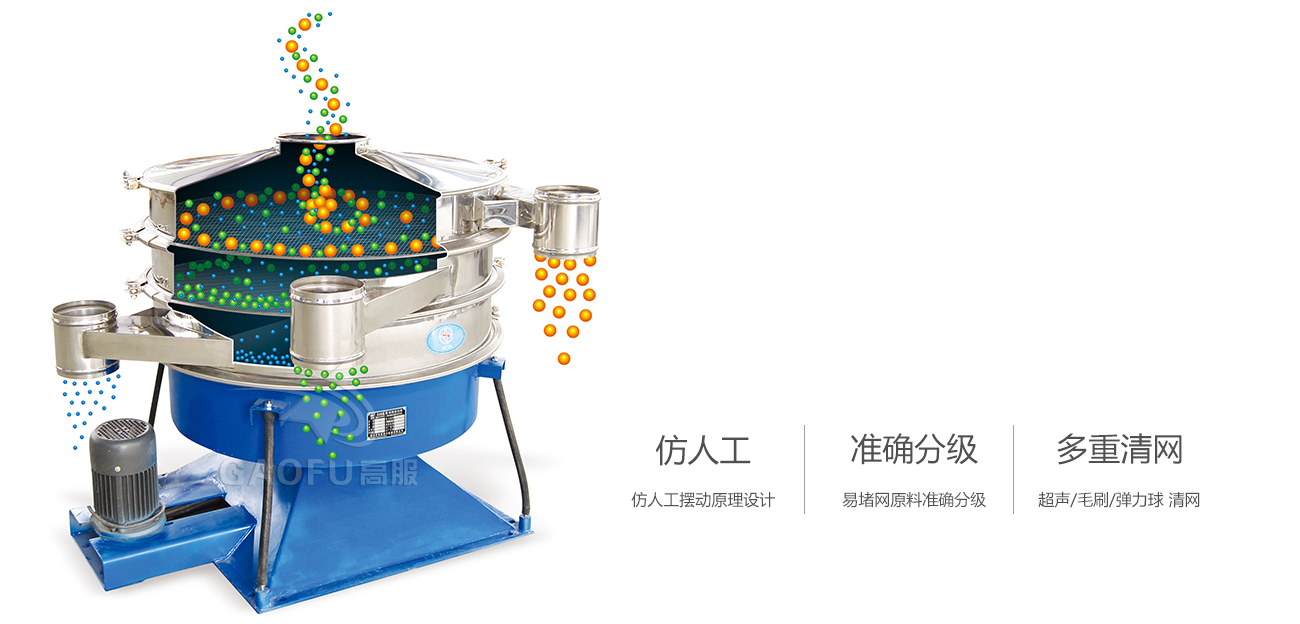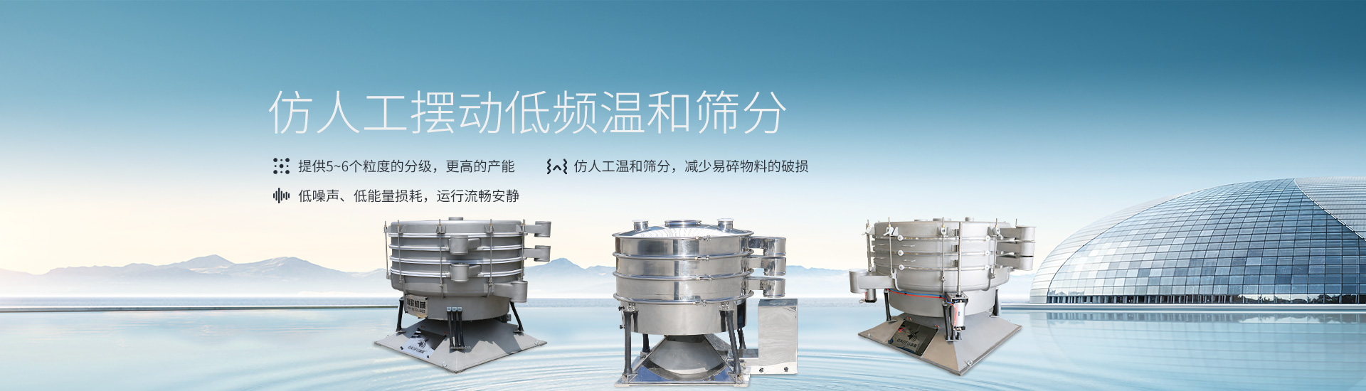 摇摆筛是一种仿人工摇动的低频旋振筛,其原理是:瞬时运动为沿径向的位移和以此位移为轴的圆周运动的合成(螺旋运动),即可调节偏心距的激振器产生了非线性三维运动,物料也产生同样的近似手动作业的运动,从而达到筛分之目的,再配合筛分附件可获得更加理想的筛分效果适合于圆形状、圆柱状、片状、乃至 于规则形状易堵网且需要精细筛分的物料。