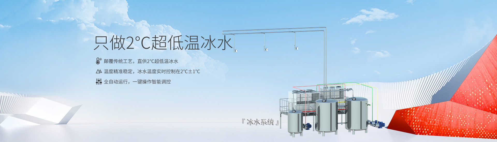 直供2℃超低温冰水,彻底解决食品行业依赖制冰机制冰、人工调和冰水的低效痛点。 | 突破传统制冰工艺限制,冰水温度实时控制在2°±1°℃,无需人工干预,杜绝温度波动风险,保障生产标准化。 | 系统自动恒温补冷,避免制冰、碎冰、储冰环节的能耗与时间浪费,综合能耗降低30%以上。 | ||