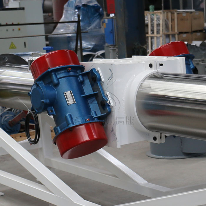振动给料机的基本工作原理为,设备起动后,呈对称布置的两台相同型号和规格的振动电机或激振器作同步反向运转,其产生的激振力通过传振体—电机或激振器底座传递到整个振动体—给料槽上,使料槽作周期性振动,从而使料槽内的物料随之一同向排料端作定向跳跃式运动,完成物料的输送作业。