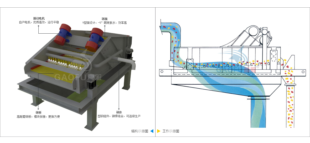 V型筛面设计,-5゜过筛面爬坡脱水,干排尾矿含水低、效率高,单位面积处理能力大。 | 高耐磨筛板使用寿命长,模块化组装设计,更换方便,节约成本,筛孔尺寸可根据要求选择。 | 型钢组件铆焊结合的方式,构成无内应力、强度高、质轻耐用的机架主体。 |