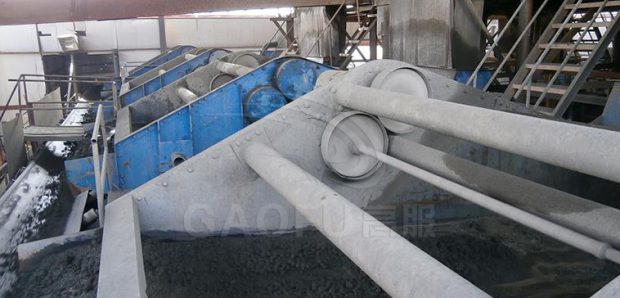 脱水振动筛采用双电机自同步技术,通用型偏心块、可调振幅振动器。主要由筛箱、激振器、支承系统及电机组成。通过胶带联轴分别驱动两个互不联系的振动器作同步反向运转,两组偏心质量产生的离心力沿振动方向的分力叠加,反向离心抵消,从而形成单一的沿振动方向的激振动,使筛箱做作往复直线运动。