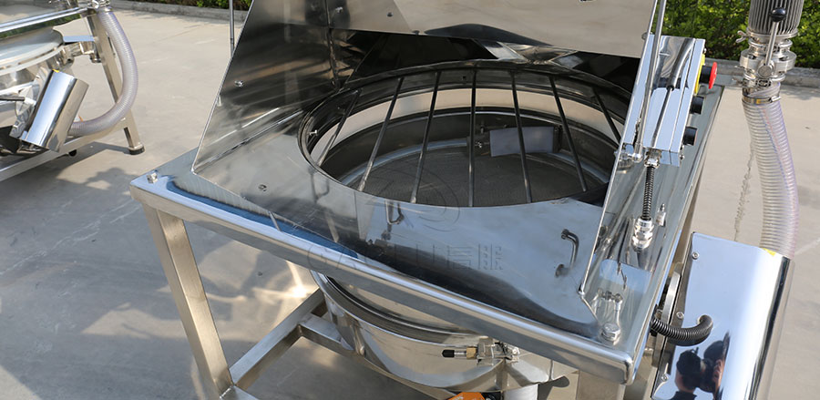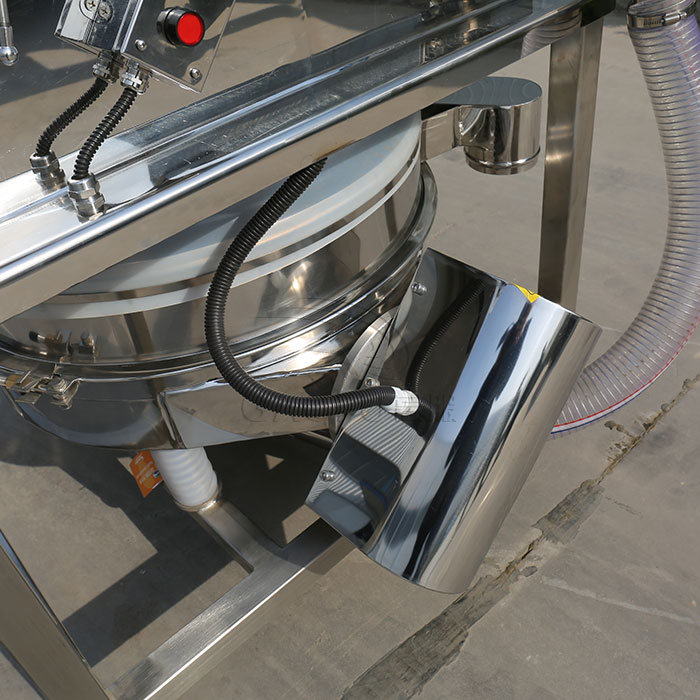 当小袋物料需解袋并倒入下一道工序时,只需人工直接拆包后投入到该系统,投料时所产生的物料粉尘由集尘风机进行收集。物料通过振动筛(安全筛网)可将大块物料和异物拦截,从而保证符合要求的成品(合格物料)进入下道工艺。